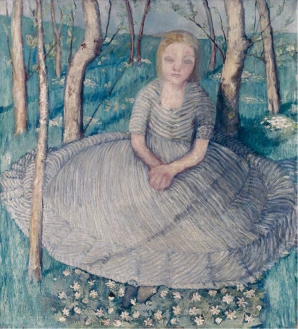 @ Paula Modersohn-Becker, Mädchen zwischen Bäumen auf einer Wiese mit blühenden Anemonen sitzend, um 1901, Paula-Modersohn-Becker-Stiftung, Bremen,